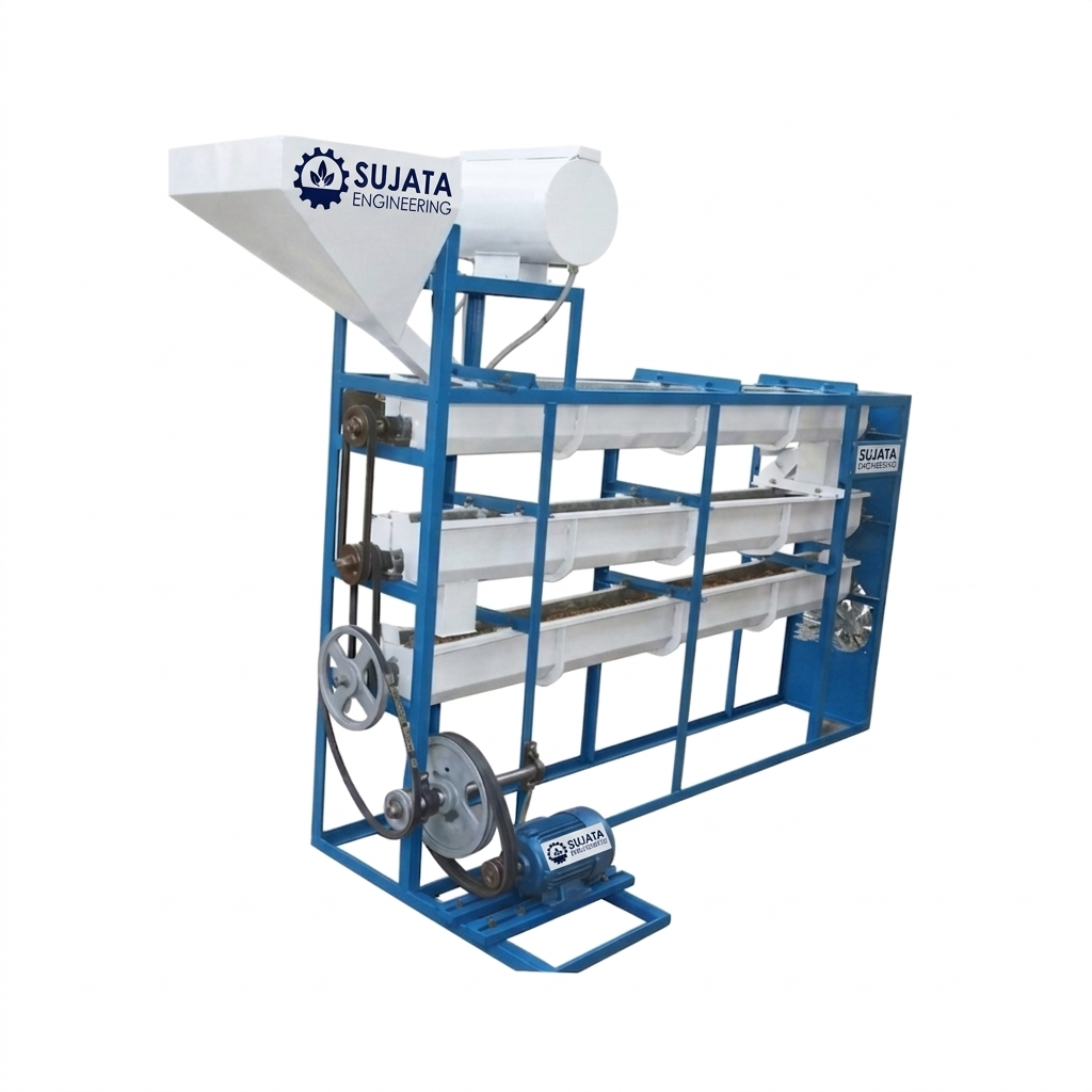 The bottom two screws are covered with nylon rope and leather which gently rub the pulses, while the top screw applies polishing material. This process ensures a smooth, shiny finish for all types of pulses.The machine has a polishing capacity of approximately 1000 to 1500 kg per hour and operates efficiently with a 3 HP electric motor. It is easy to operate, durable, and suitable for small and large scale dal processing units.